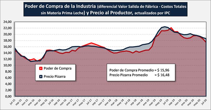 Viendo el precio pizarra liquidado y comparado con la capacidad de pago promedio de la industria, actualizada por IPC, para un período más prolongado, puede observarse que en el largo plazo (salvo oscilaciones temporales) los valores promedio convergen: $ 16,48 por litro de Precio Pizarra y $ 15,96 por litro de Poder de Compra.