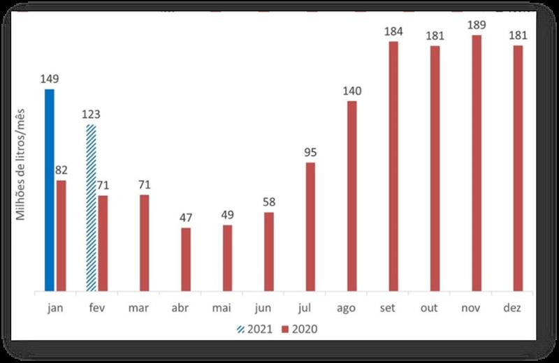 Siguiendo el ritmo actual de llegada de volúmenes extranjeros, cerraremos febrero / 2021 con más de 120 millones de litros importados, un incremento del 74% en el mes . ¡Es una gran cosa!