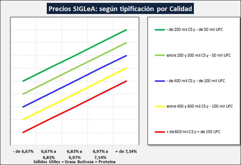 Los precios publicados surgen del promedio del precio básico + bonificaciones de calidad por estrato + el promedio de bonificaciones comerciales ponderados por litro. Los parámetros higiénicos y sanitarios son fijos mes a mes y los parámetros composicionales para definir cada rango variarán por mes en función a la estructura composicional (grasa butirosa + proteína).
