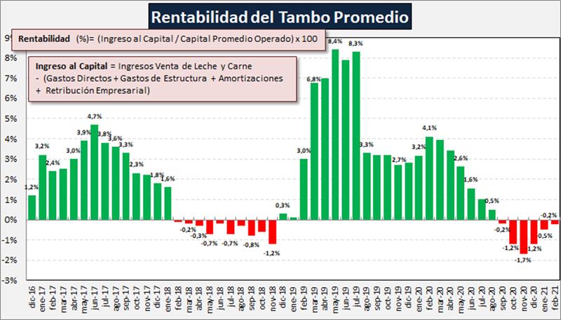 Claramente puede verse en el gráfico anterior que el precio percibido en 5 meses del año 2019 (mar/jul) era superior no sólo al costo de producción, sino que cubría el costo de oportunidad exigido sobre el capital promedio operado, luego el precio a pesar de generar rentabilidad positiva, ésta fue inferior al 5% y ya en los últimos meses (sep/20-feb/21) el precio percibido promedio no logra cubrir tampoco el costo de producción promedio. Sí podemos observar una tendencia a retomar un precio por encima del costo en marzo e ir acercándose hacia el precio de equilibrio si se mantienen las expectativas de precios al productor y el menor aumento de costos sobre todo por vía de los concentrados.