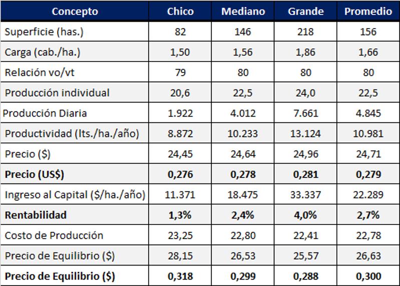 Si suponemos una tasa de rentabilidad exigida al capital del 5%, se debería generar un Ingreso Neto por hectárea que dividido por los 7.950 litros de leche de productividad promedio, deberían generar un valor de costo de oportunidad al capital promedio operado de $ 2,79/litro de leche. Por lo tanto, el Precio de Equilibrio sería en este supuesto de $ 29,44/litro de leche ($ 24,95 de Costo Total + $ 4,49 de Rentabilidad al Capital), unos US$ 0,332/litro.