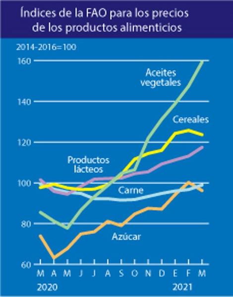El índice de precios de los productos lácteos de la FAO registró un promedio de 117,4 puntos en marzo, esto es, un alza de 4,4 puntos (un 3,9 %) desde febrero, lo que representa el 10.º mes consecutivo de aumentos y empuja el índice cerca de un 16 % por encima del valor registrado en el mismo mes del año pasado. En marzo, subieron los precios internacionales de la manteca, sobre todo por una cierta escasez de suministros en Europa debida al lento inicio de la campaña de producción de leche y al aumento de la demanda interna en previsión de una recuperación del sector de los servicios alimentarios. Los precios de la leche en polvo también subieron, apoyados por un aumento repentino de las importaciones en Asia, especialmente en China, como resultado de la preocupación por posibles problemas de abastecimiento a corto plazo en un contexto de disminución estacional de la producción de leche en Oceanía y de escasa disponibilidad de contenedores para el transporte en América del Norte y Europa. Por el contrario, los precios del queso disminuyeron ligeramente por tercer mes consecutivo debido a la limitada demanda de suministros al contado.