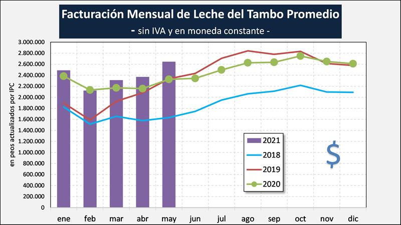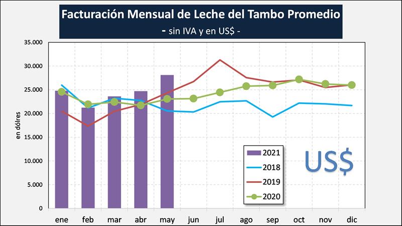 El aumento interanual de la producción del período enero-mayo del tambo promedio fue, como indicamos más arriba, del 5,8% a lo cual se le adiciona la suba en el precio en dólares para dicho período del 1,8% lo que permite lograr un incremento de la facturación del 7,7% en los primeros cinco meses del año 2021 respecto a igual período del año anterior.