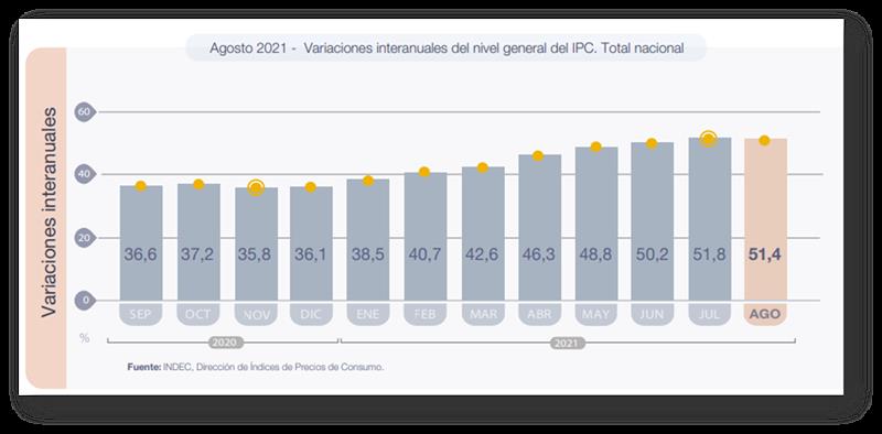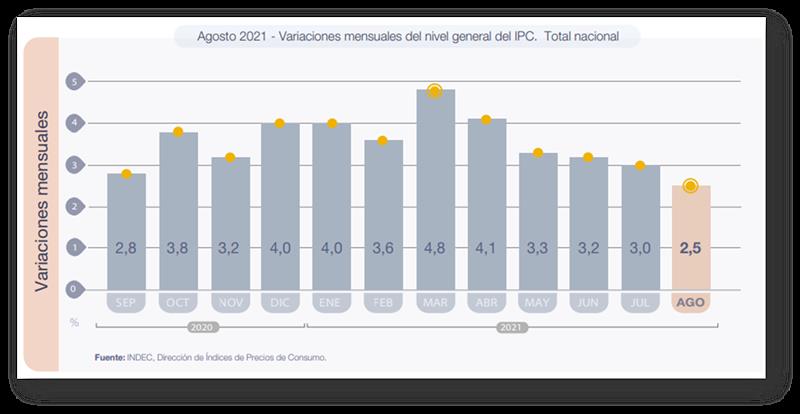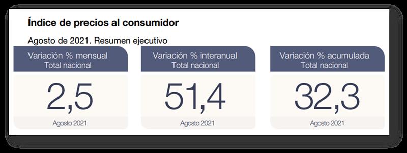 El nivel general del Índice de precios al consumidor (IPC) representativo del total de hogares del país registró en agosto una variación de 2,5% con relación al mes anterior, del 32,3% en el período enero-agosto 2021 y del 51,4% en el interanual.
