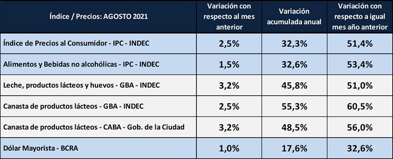 Precios de los lácteos al mes de agosto del 2021 15/9/2021
