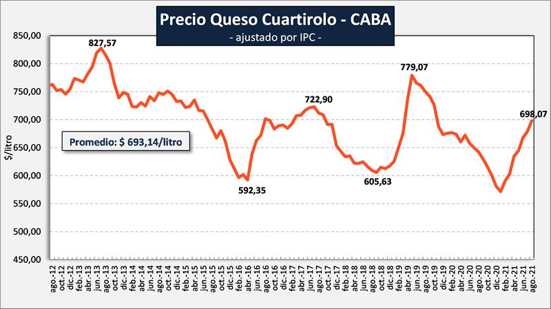 En el caso del queso cuartirolo, tiene una situación bastante similar a la planteada en el caso de la leche fluida. Estuvo en descenso prácticamente dos años, con recupero en los últimos siete meses y en agosto está +0,7% que el promedio y 10,4% por debajo del máximo de mediados del 2019 y 15,6% por debajo del máximo de esta serie a mediados del 2013.