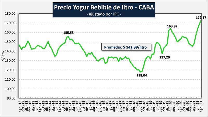 La situación de los yogures bebibles de litro es diferente, sostienen el nivel de consumo de la categoría, sus precios se ajustaron durante 2020 con el ritmo inflacionario, pero lamentablemente tiran para abajo el promedio del mix, ya que su aumento de ventas no fue acompañado por las ventas de yogures en pote, postres y flanes que tienen un mayor valor por litro equivalente.