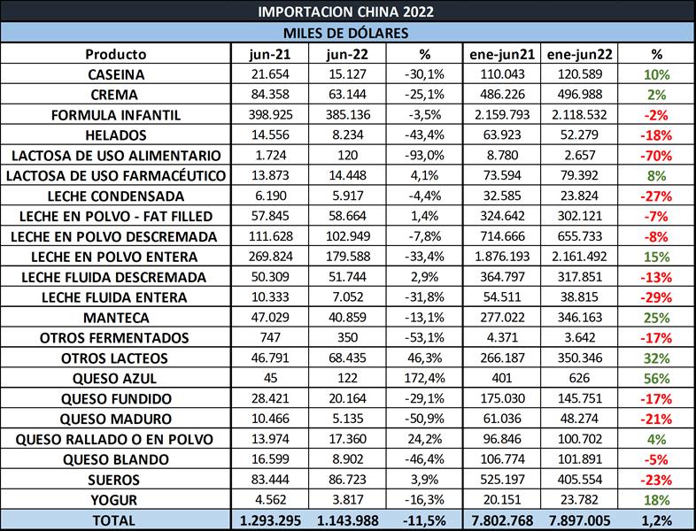 En el mes de junio próximo pasado el volumen de productos lácteos importados por China tuvo una baja del 21,2%, 36,1% en litros de leche equivalentes y 11,5% en el monto total en dólares, según el dato obtenido de Aduanas de China.