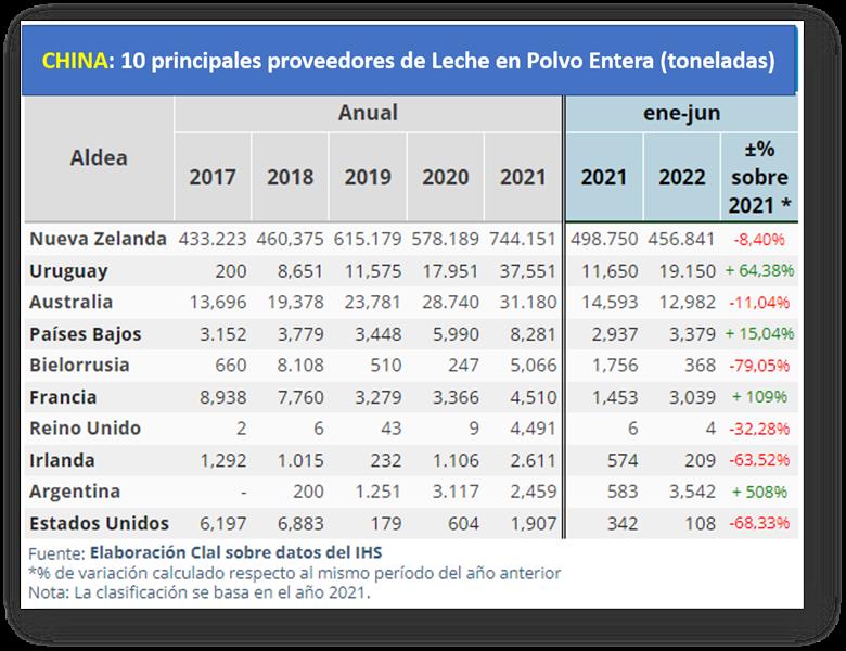 China es el principal importador de Leche en Polvo Entera y su principal proveedor es Nueva Zelanda quien ostenta el 91% de participación de ese producto en el gigante asiático, en el primer semestre de 2022 (93% en el primer semestre de 2021).