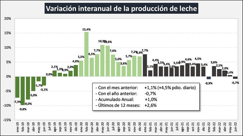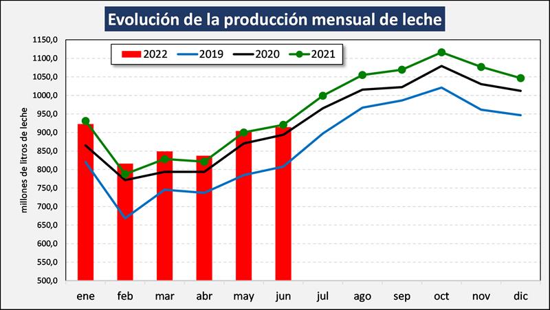 En el mes de junio de 2022 la producción fue de 914,2 millones de litros de leche, esto implica un valor 1,1% por encima del mes anterior (+4,5% en el promedio diario) y un 0,7% menos que igual mes del año anterior.