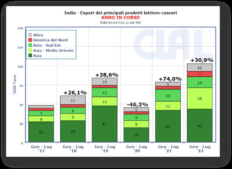 Con un salto de +30,9%, India aumenta sus exportaciones de productos lácteos superando las 100.000 toneladas en el periodo enero-julio de 2022 (respecto al mismo periodo de 2021). El mes de julio también confirmó un fuerte aumento (+24,6%).