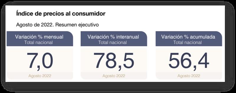 El nivel general del Índice de precios al consumidor (IPC) representativo del total de hogares del país registró en agosto una variación de 7,0% con relación al mes anterior, 56,4% en los ocho meses transcurridos del año y del 78,5% en el interanual.