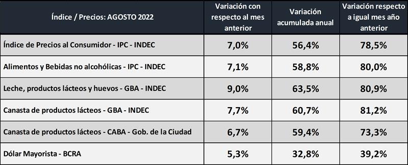 Cabe mencionar que para el rubro “Leche, productos lácteos y huevos” de GBA, el INDEC mide una variación del 9,0% respecto al mes anterior, y + 80,9% en la variación interanual (este índice anual varía por región entre 66,0% y 71,7%).