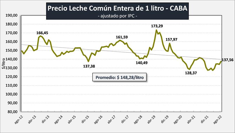 Según datos publicados por la Dirección General de Estadísticas y Censos - Ministerio de Hacienda del Gobierno de la Ciudad de Buenos Aires, los precios de los productos lácteos de esta canasta, tuvieron un crecimiento mensual promedio ponderado del 6,7%, en el período enero-agosto del 59,4%, e interanual del 73,3%. El ponderado es elaborado por OCLA sobre el mismo criterio mencionado para la canasta GBA de INDEC.
