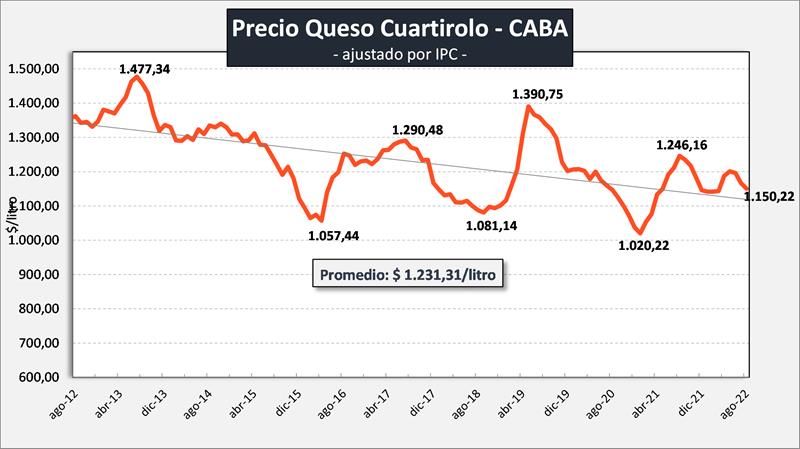 En el caso del queso cuartirolo, tiene una situación bastante similar a la planteada en el caso de la leche fluida. Estuvo en descenso prácticamente dos años, con recupero en los primeros ocho meses del 2021, y en agosto 2022 está -6,6% que el promedio y 17,3% por debajo del máximo de mediados del 2019 y 22,1% por debajo del máximo de esta serie a mediados del 2013, lo cual marca claramente una tendencia descendente también en el precio en esta serie histórica de 10 años.