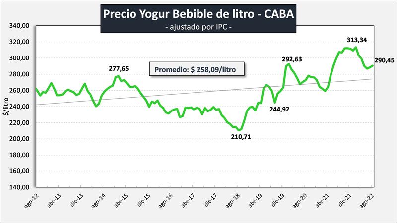 La situación de los yogures bebibles de litro es diferente, sostienen el nivel de consumo de la categoría, sus precios se ajustaron con el ritmo inflacionario, frenándose en los últimos dos meses de 2021, cayendo en enero de 2022, recuperando un 1,3% en febrero último y cayendo desde marzo a junio y con leve recuperación en julio y agosto. Lamentablemente tiran para abajo el promedio del mix, ya que su aumento de ventas no fue acompañado por las ventas de yogures en pote, postres y flanes que tienen un mayor valor por litro equivalente.