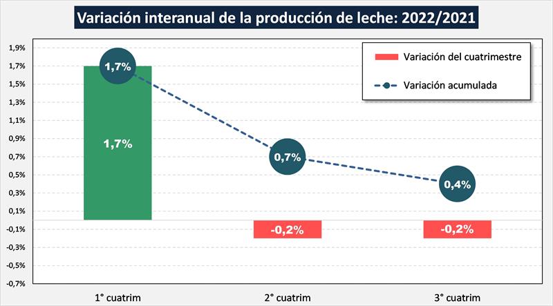 De la ponderación de las variaciones informadas, surge una caída estimada del 0,2% para el último cuatrimestre del año, lo que consolidaría un crecimiento anual del 0,36%, es decir 11.595 millones de litros de leche producidos en 2022.