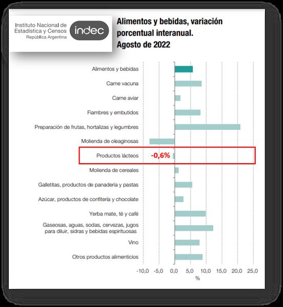 En los productos lácteos el índice fue de 136,2 lo que indica una suba del 16,9% con el mes anterior, y baja el 0,6% con igual mes del año anterior. El acumulado del período ene-ago del año es 0,8% superior a igual período del año anterior.