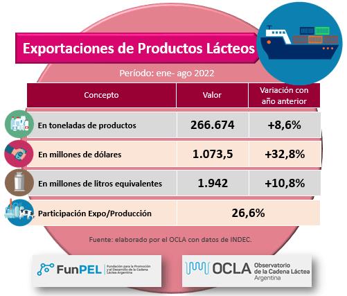 Cifras definitivas de exportaciones a agosto de 2022 con datos de la Dirección Nacional Láctea: