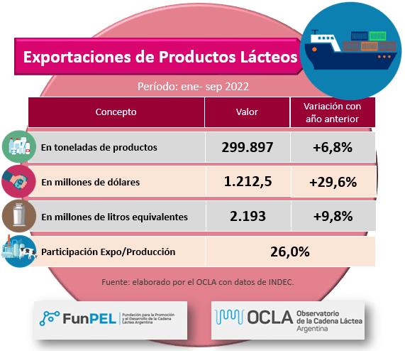 En litros de leche equivalentes, las exportaciones crecieron el 9,8% y representaron en el período enero-septiembre del año 2022, el 26,0% de la producción total.