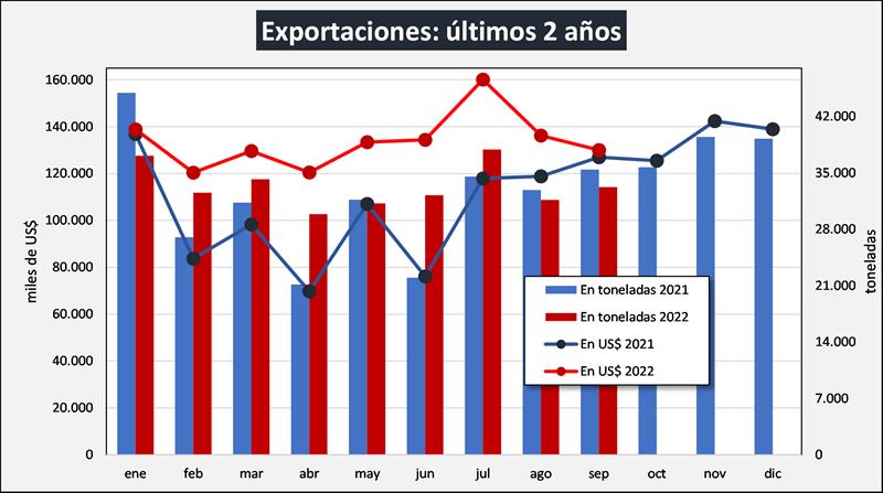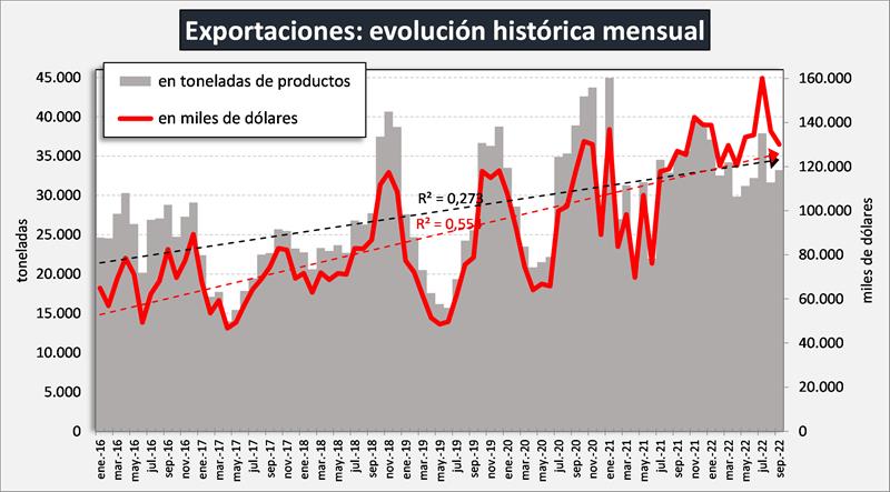 La variación intermensual de las exportaciones fue de +5,0% en volumen y de +2,1% en valor (sep/22 vs. ago/22). La variación interanual fue de -6,1% en volumen y +2,4% en valor (sep/22 vs. sep/21).