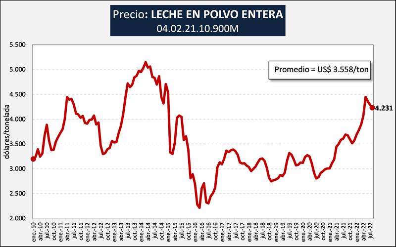 El precio medio de exportación por tonelada fue de US$ 4.043 para los 9 primeros meses del año, lo que implicó un incremento del 21,4% respecto a 2021. En el caso particular del rubro Leches en Polvo, el precio promedio fue de US$ 3.995/ton., un 19,9% por encima del igual período del año anterior.