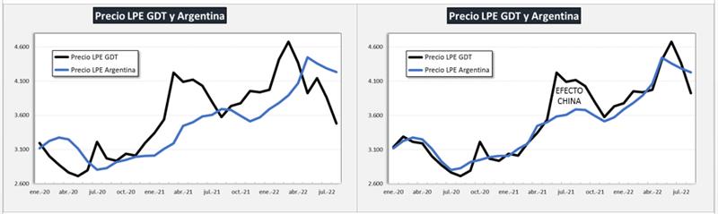 Para aclarar gráficamente esta aseveración, se compara el precio de la LPE de Argentina y del GDT, donde puede verse en el gráfico de la derecha, qué si corremos los precios de Argentina hacia atrás o los del GDT hacia adelante 3 meses, las curvas coinciden plenamente, salvo en este análisis el período marzo-junio 2021 donde los precios de NZ fueron muy altos particularmente por las compras de China (93% de sus compras son a NZ).