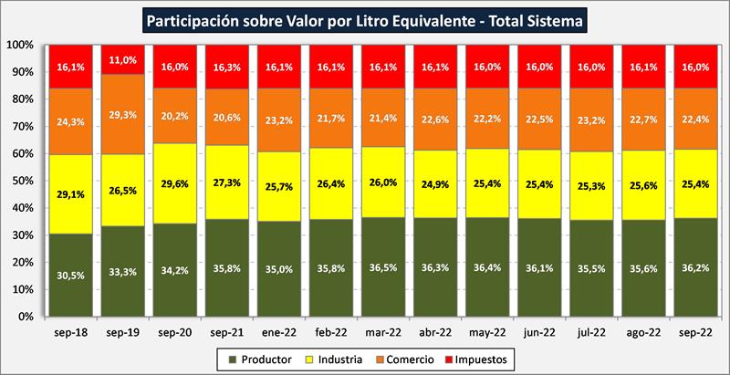 La participación del productor en el total del sistema fue para septiembre de 2022 del 36,2%, 0,6 puntos por encima del mes anterior, bastante por encima de la media del 31,7%. Un incremento de 0,5 puntos en los valores finales de mercado interno y una mejora de 0,8 puntos porcentual en la participación de los valores de mercado externo, colocándola 2,7 puntos por debajo de la media histórica de la serie disponible (64,1%). La participación del productor sobre el valor de salida de fábrica (precio al que vende la industria) fue de 58,8%, 0,7 arriba del mes pasado y 5,6 puntos encima del promedio de la serie (53,2%). Cabe recordar que la serie histórica para los valores de salida de fábrica tiene una mayor extensión temporal que el resto.