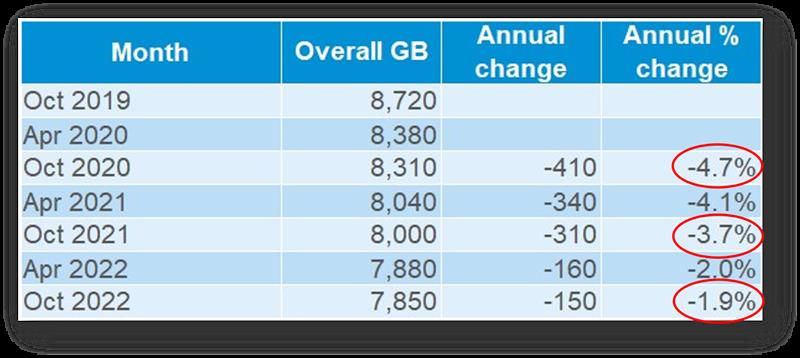 GRAN BRETAÑA: reducción en el número de productores 4/11/2022El número de productores de leche de GB se reduce marginalmente a pesar de un año difícil La encuesta más reciente de los principales compradores de leche estimó que en octubre de 2022 había 7.850 productores de lácteos en GB. Esta es una reducción de 150 productores (1,9%) en comparación con octubre de 2021, y una disminución de solo 30 (0,4%) en comparación con abril de este año. Si bien los costos de los insumos continuaron aumentando durante el último año, el aumento de los precios de la leche ayudó a compensar los costos más altos. Esta puede ser la razón por la que menos agricultores han abandonado la industria en comparación con años anteriores. Las últimas cifras sugieren que el volumen promedio por granja en GB es de 1,57 millones de litros por año (4.300 litros/día), en línea con los observados tanto en octubre de 2021 como en abril de 2022. Gráfico de números de productores GB y volumen de leche producida por granja: ![]() Cuadro de la evolución del número de productores a octubre y abril desde 2019 a 2022: ![]() traducido y extractado por el por el OCLA del newsletter de AHDB Dairy por Charlotte Forkes-Rees