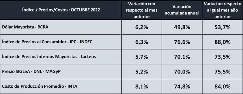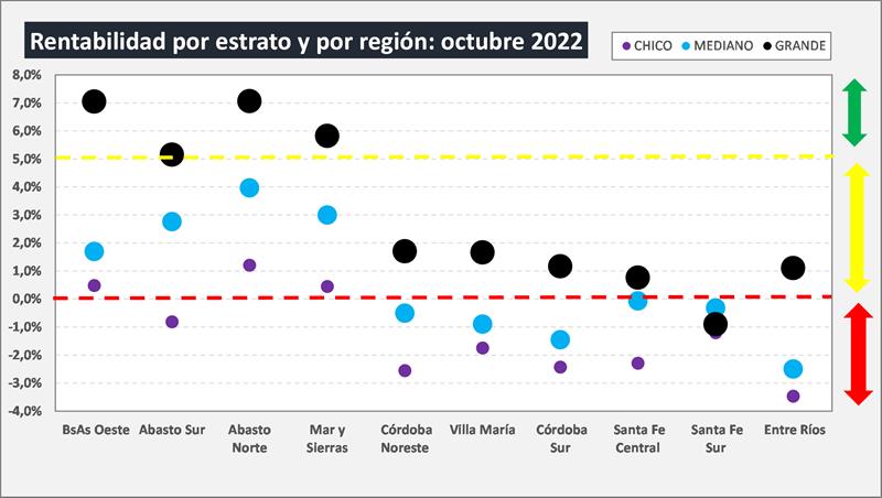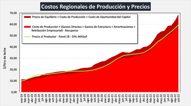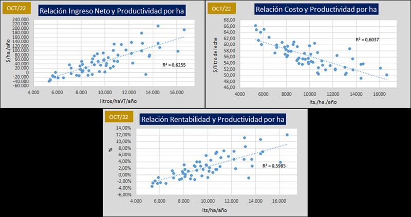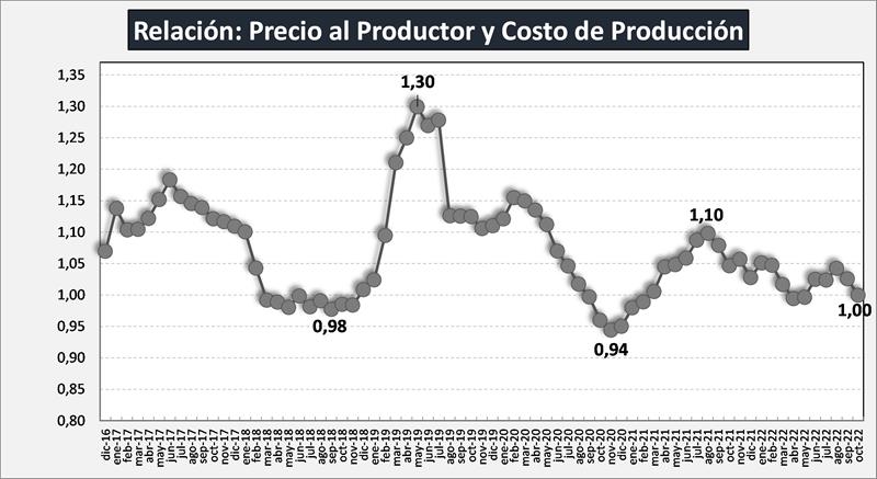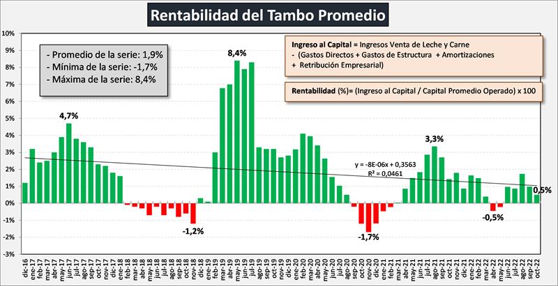 Costos Regionales de Producción de Leche, valores actualizados a OCTUBRE del 2022 24/11/2022![]() Precio al Productor: en base al precio por provincia de DNL – MAGyP (SIGLeA-LUME), calidad y volumen de cada tambo en los 30 modelos regionales. Costo de Producción: (Gastos Directos + Gastos de Estructura + Amortizaciones + Retribución Empresarial) – Recuperos (venta y/o cesión de terneros, y vacas y toros de rechazo). Precio de Equilibrio: Costo de Producción + Costo de Oportunidad al Capital (5%). Ingreso al Capital: (Ingreso por Leche + Ingreso por Carne) - (Gastos Directos + Gastos de Estructura + Amortizaciones +Retribución Empresarial). Rentabilidad: (Ingreso al Capital / Capital) x 100 Rentabilidad Cuando el precio comienza a superar al Costo de Producción, se genera Ingreso al Capital positivo y por ende Rentabilidad. La decisión de evaluar otra alternativa como destino del capital, surge de comparar la tasa de rentabilidad de la producción de leche y la tasa de la inversión alternativa. ![]() La tasa de rentabilidad promedio en octubre de 2022 continuó en el cuadrante positivo con el 0,5% (la más baja de los últimos 5 meses). En el período analizado (dic16-oct22) la tasa de rentabilidad promedio fue del 1,9% con un máximo del 8,4% y un mínimo de -1,7%. La macro, los precios y los costos ![]() El Costo de Producción Promedio subió en octubre de 2022 un 8,1% respecto al mes anterior, un 74,8% en el período enero-octubre y llega a un 84,0% de variación interanual. En la variación anual (oct22/oct21) el costo se ubica algo por debajo de la suba inflacionaria (IPC) y 8,5 puntos porcentuales por encima del precio recibido (SIGLeA), y este último estuvo por encima de los Precios Mayoristas de INDEC, conocidos como en Salida de Fábrica (73,5%) y bastante por encima del precio de la LPE exportación en pesos (64,4%). Evolución del Precio Cobrado, Costos de Producción y Precio de Equilibrio ![]() Desde marzo de 2021 y hasta marzo 2022 el precio al productor (aunque con altibajos) superó al costo de producción de leche (relación superior a 1), pero en ningún momento alcanzó al precio de equilibrio, que exige una rentabilidad sobre el capital operado del 5% anual, ya que la rentabilidad promedio de ese período fue del 1,6% con extremos entre 0,0% y 3,3%. En abril y mayo el costo prácticamente iguala al precio percibido y genera tasas de rentabilidad levemente negativas (-0,2% y -0,5%) y en junio-septiembre próximos pasados la rentabilidad vuelve a ratios positivos, cubriendo el Costo de Producción, pero aún distante del Precio de Equilibrio. En octubre, la relación entre el precio percibido y el costo de producción es prácticamente 1 a 1 y anticipa una posible situación por debajo de 1 para el próximo mes, en virtud que el precio (por las actuales condiciones de mercado) se viene ajustando por debajo de la inflación. Relación entre el Precio al Productor y el Costo de Producción: ![]() El Ingreso Neto, el Costo de Producción y la Rentabilidad tienen una vinculación muy fuerte con la Productividad medida en litros de leche producidos por hectárea y por año como puede visualizarse en los gráficos siguientes. ![]() Si observamos la tasa de rentabilidad en función al tamaño de los tambos y la región de producción, podemos ver que existe una gran dispersión en la tasa que se pude lograr respecto al capital promedio operado, en función a esas variables observadas. Además, podemos visualizar claramente que hay una diferencia estructural, respecto a la rentabilidad obtenida entre las regiones productivas, que tienen mucha vinculación con la escala y la incorporación de tecnologías de insumos y procesos que determinan muchas diferencias en la eficiencia y la productividad. ![]() Para un análisis completo de los Costos Regionales de Producción: https://www.ocla.org.ar/contents/newschart/portfolio/?categoryid=15 elaborado por el OCLA sobre la publicación de Costos Regionales de Producción - INTA