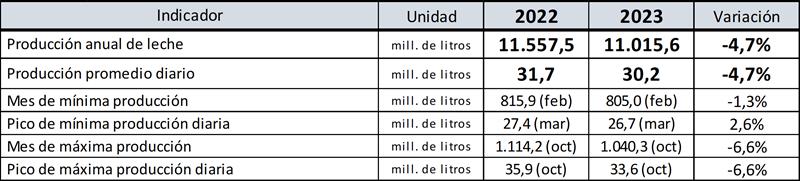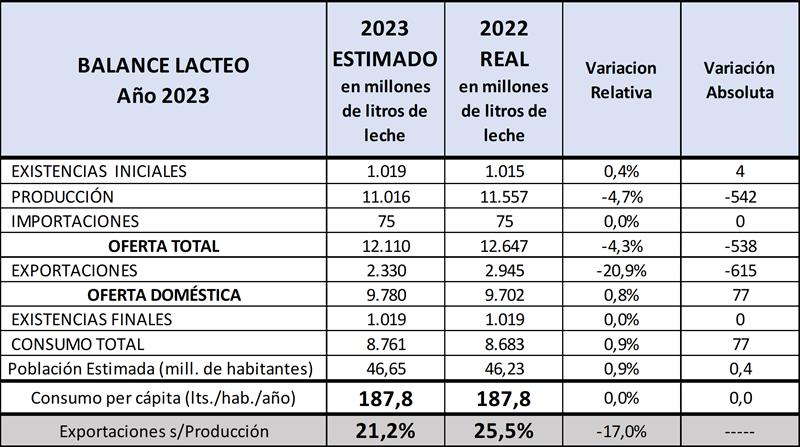 Estimación de Producción de Leche – año 2023, revisión 28/3/2023El año 2022 finalizó con una producción de 11.557,4 millones de litros de leche, lo que implica un crecimiento respecto a 2021 del 0,04%. Recordamos que nuestra proyección para 2022 (con datos de 20 industrias), publicada el 28/01/22 arrojaba un crecimiento interanual del 0,59% (para leer, click aquí). Como dato adicional, cabe acotar que la producción medida en sólidos útiles (grasa butirosa + proteína), tuvo un crecimiento interanual del 1,7% ya que los sólidos pasaron de 7,05% en 2021 a 7,17% en 2022. A finales del año pasado procedimos a realizar un nuevo relevamiento con datos aportados por las industrias, en este caso para el año 2023, arrojando una valor estimado de 11.472,7 millones de litros, es decir una reducción del 0,73% respecto al año 2022. En virtud de la profundización de la sequía y de las complicaciones económicas, hemos decidido realizar una revisión en esto días para tener un panorama de la situación, y de aquí surgen los datos que a continuación presentamos Criterio Metodológico: Se les solicitó a unas 30 industrias, que nos brinden su estimación para la producción 2023 respecto a 2022 (ya considerando para enero y febrero los datos reales). Los datos aportados corresponden a la variación interanual a tambo constante de cada mes de 2023 respecto a igual mes del año anterior y la variación total anual. Cada una de las variaciones es ponderada en función a la participación de cada industria en la captación nacional de leche que disponemos del Ranking Industrial que elabora OCLA. Se suman las ponderaciones mensuales de cada industria y las mismas se aplican sobre la producción real de cada mes y total del año anterior, en este caso 2022, para obtener los litros estimados de producción para cada mes de 2023 y total. Esta estimación surge de la información aportada por unas 15 industrias lácteas que reciben y procesan alrededor del 50% de la leche de Argentina, sin ninguna otra intervención de OCLA sobre dicho números. Cabe acotar que esta estimación sólo trata de brindar una perspectiva para el año 2023, sobre la base de los datos disponibles al momento de efectuarla. Las condiciones de alta volatilidad e incertidumbre que seguramente caracterizarán el año en curso, pueden generar importantes diferencias respecto a los números proyectados, que iremos evaluando en la medida que ocurran.![]() ![]() ![]() ![]() ![]() Por último, en base al Balance Lácteo del Año 2022, a la estimación de producción de 2023 y considerado un aumento del consumo total por el crecimiento vegetativo de la población, pudimos ver que está absolutamente garantizado con estos números el abastecimiento doméstico y se produciría una baja en el volumen exportado del orden del 20%, si se mantienen iguales niveles de stocks del año pasado que de consumirse en un 50% podríamos igualar los volúmenes exportados en 2022. Por último, en base al Balance Lácteo del Año 2022, a la estimación de producción de 2023 y considerado un aumento del consumo total por el crecimiento vegetativo de la población, pudimos ver que está absolutamente garantizado con estos números el abastecimiento doméstico y se produciría una baja en el volumen exportado del orden del 20%, si se mantienen iguales niveles de stocks del año pasado que de consumirse en un 50% podríamos igualar los volúmenes exportados en 2022.![]()