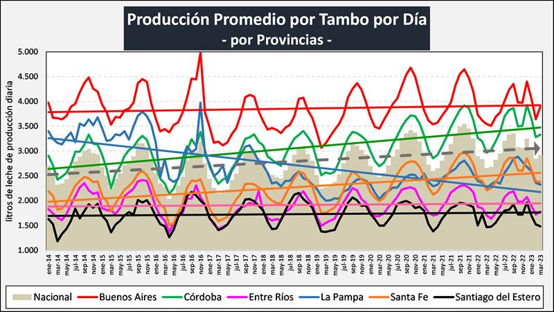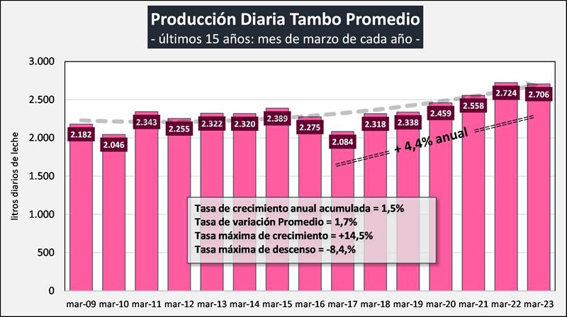 Sobre la base de la producción mensual y la cantidad anual de tambos (SENASA), podemos inferir el tamaño del tambo promedio, unos 2.706 litros de leche diarios para marzo de 2023, un 0,7% menos que el año anterior. Si evaluamos su comportamiento en el tiempo, a pesar de la disminución en el número de unidades productivas y en el número de vacas, el tambo promedio presenta en el período 2009-2023 una tasa de crecimiento acumulada anual del 1,5%, lo que permite el sostenimiento e incluso aumento de los niveles productivos agregados a nivel país.