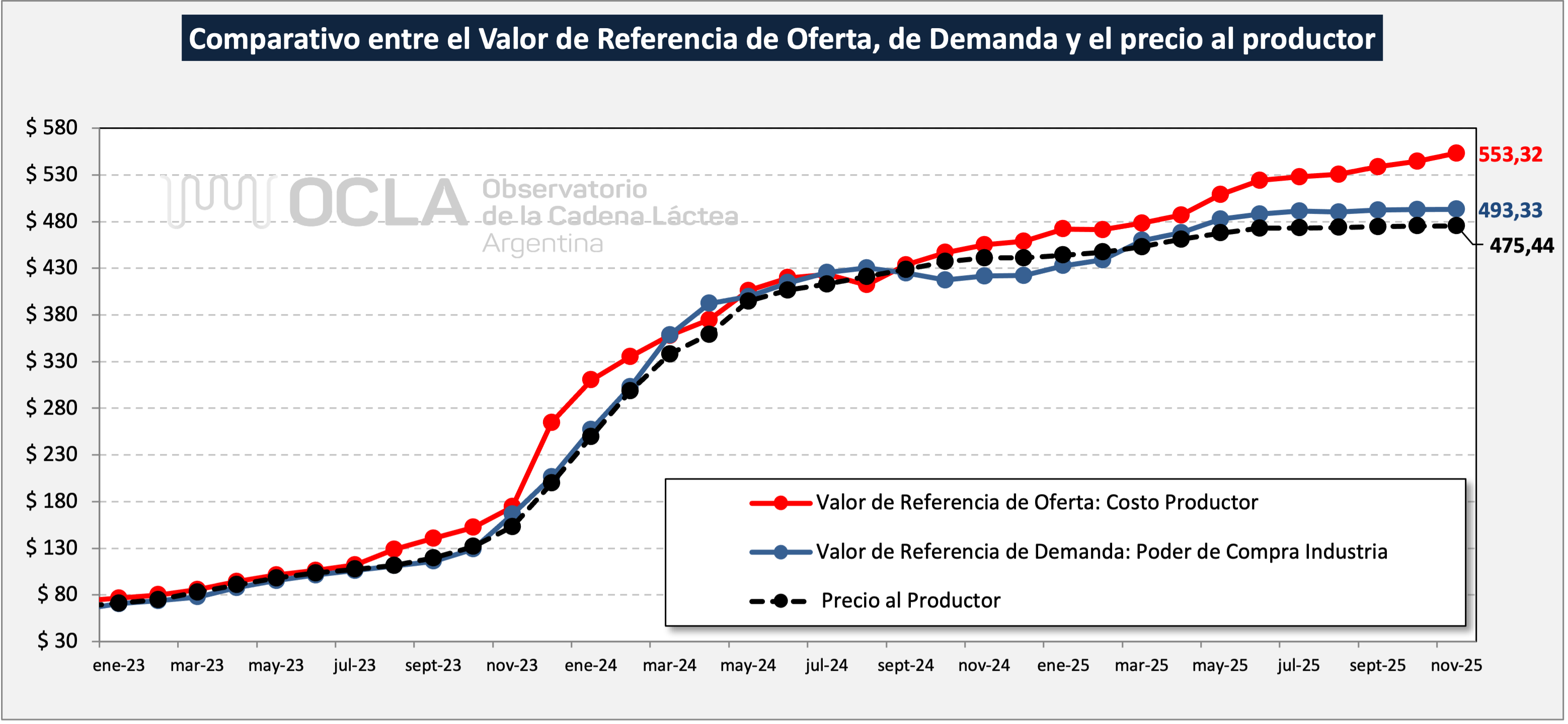 Valor de Referencia de Oferta: expresa la necesidad de ingreso por litro de leche del sector de producción primaria (gastos directos + gastos de estructura + amortizaciones + una tasa de interés al capital).
