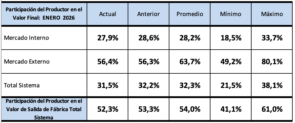 En el último renglón se agrega un análisis de la participación del valor que recibe el productor comparado con el valor de salida de fábrica (precio al que vende la industria) para el total del sistema (ambos mercados).