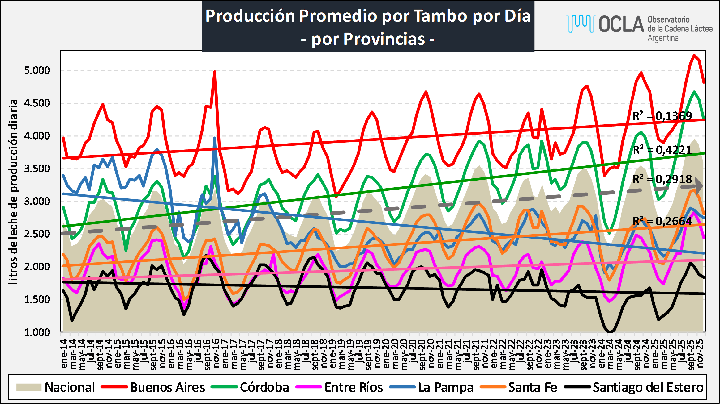 Producción por Vaca en Ordeño y por día: evolución anual