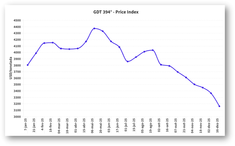 El Global Dairy Trade (GDT), referente para la fijación de precios en el comercio mundial de lácteos, reflejó a lo largo del año la dificultad de mantener los precios en un entorno de alta oferta. Las caídas observadas en los precios de los productos lácteos a lo largo de 2025 indican que el ajuste necesario para permitir el flujo del volumen adicional se produjo principalmente a través de los precios. Si bien hubo fluctuaciones ocasionales entre subastas, el comportamiento general indicó un mercado bajo presión, con los precios de los principales derivados encontrando resistencia a mantenerse en niveles altos, como se puede observar en el Gráfico 3, que ilustra los movimientos de la leche en polvo entera (LPE), el principal producto comercializado, en referencia a la última subasta realizada.