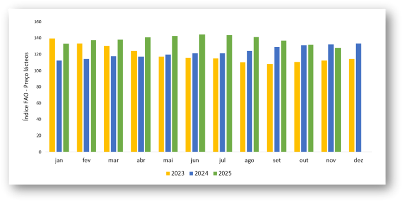 Esta interpretación es corroborada por los indicadores de la FAO, que muestran una reducción en los precios internacionales de los productos lácteos a lo largo de 2025. El comportamiento de estos índices refuerza que, aun con la demanda global manteniéndose activa, no fue suficiente para absorber el volumen adicional ofrecido por el mercado.