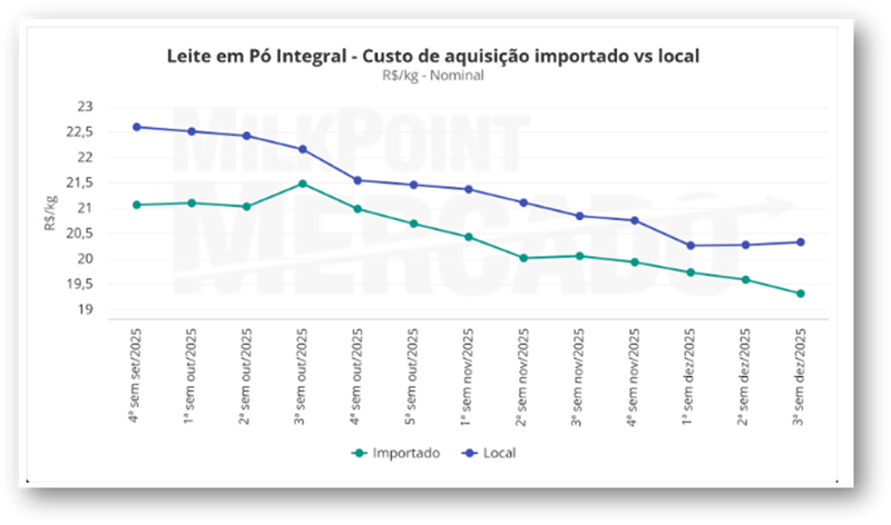 Estos movimientos no se produjeron de forma aislada. Al ajustar el análisis a una escala más cercana al mercado brasileño, los datos de una encuesta realizada por MilkPoint Mercado con actores del Mercosur muestran que la dinámica fue similar a lo largo de 2025. En un contexto de alta oferta y mayor competencia, los exportadores de la región comenzaron a reducir los precios repetidamente para intentar mantener el flujo de sus volúmenes hacia Brasil. A modo de ejemplo, el siguiente gráfico compara los precios practicados a nivel nacional para los LPE con los precios de este producto importado.