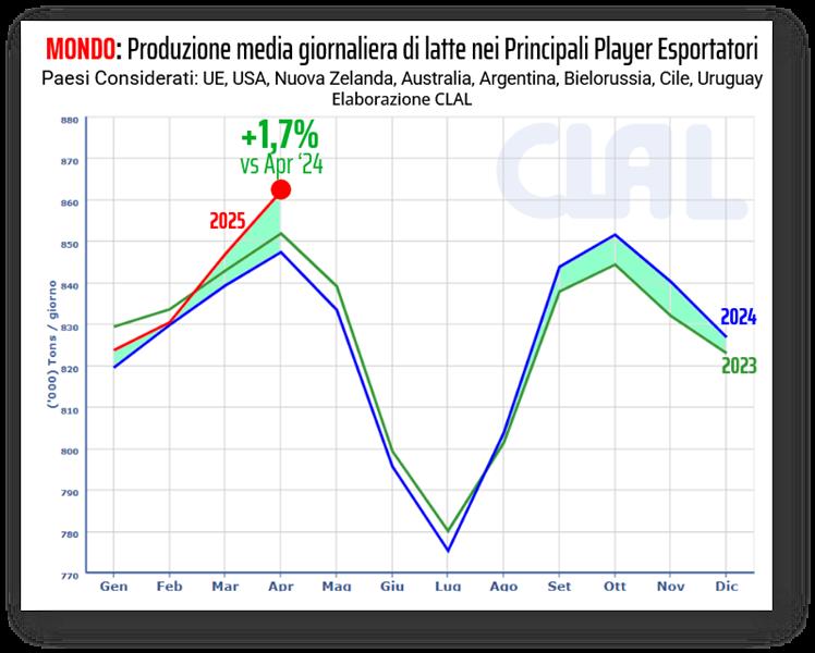 En el mundo, la producción de leche en origen sigue siendo en general muy débil y esto explica las constantes tensiones actuales sobre los precios, que podrían agravarse aún más en caso de fenómenos meteorológicos, incluso regionales, o de aumentos repentinos de la demanda internacional.