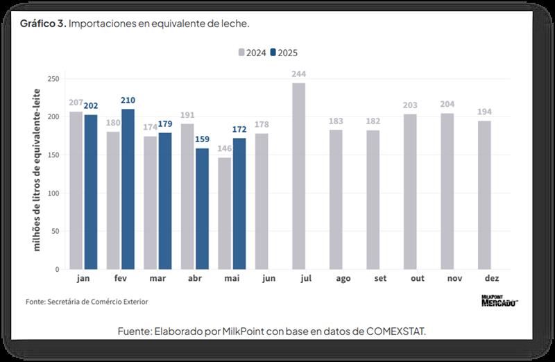 El volumen total importado en equivalente de leche el mes pasado fue de alrededor de 171,8 millones de litros de leche, lo que representa un aumento del 8% en equivalente de leche en comparación con abril y un 17,4% mayor en comparación con mayo/24.