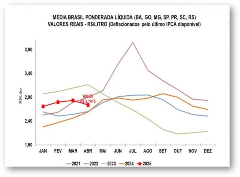 En abril, el precio de la leche pagado a los productores cayó un 3,3%, llegando a R$ 2,7415/litro, según Cepea (US$ 0,474/litro). Pese a la caída, el valor sigue siendo 5,7% superior al registrado hace un año, en términos reales.