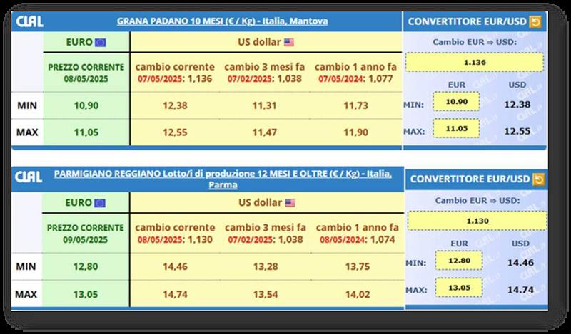 El precio actual del Grana Padano (MN – 10 meses de curación) oscila entre un mínimo de 10,90 €/kg y un máximo de 11,05 €/kg. Traducido a dólares al tipo de cambio del 7 de mayo, esto significa un precio que fluctúa entre un mínimo de $12,38/kg y un máximo de $12,55/kg. Hace tres meses (7 de febrero de 2025), el precio del Grana Padano en Estados Unidos estaba entre 11,31 y 11,47 dólares/kg, lo que significa que – con la devaluación del dólar y el fortalecimiento del euro – hoy el precio del Grana Padano es más alto en un dólar por kilogramo.