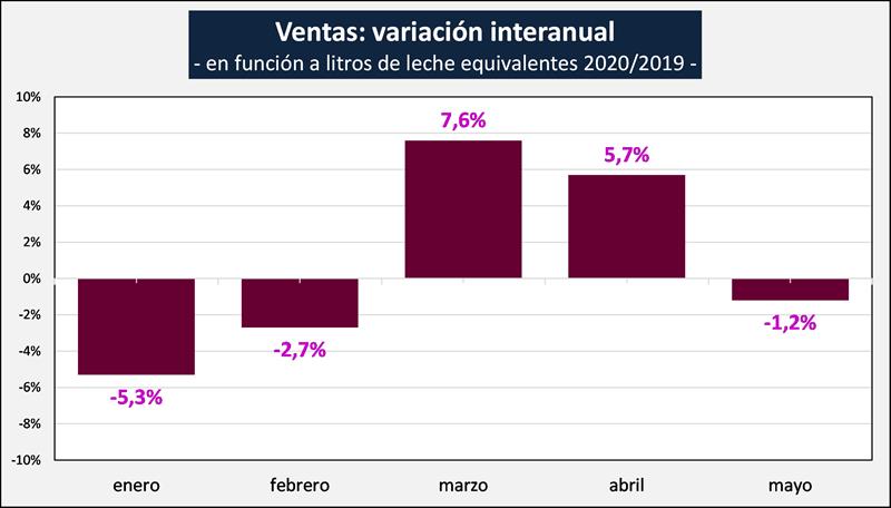 Si procedemos a analizar la evolución de las ventas mes a mes, y lo hacemos por la unidad de medida comparable que son los litros de leche equivalentes (litros necesarios para producir los productos elaborados), vemos que en enero las ventas cayeron 5,3%, en febrero 2,7% (a igual cantidad de días), subieron 7,6% en marzo, y 5,7% en abril, y vuelven a caer en mayo con lo que las cifras de marzo y abril se correlaciona con las denominadas compras de pánico ocurridas en la segunda quincena de marzo e inicios de abril. Ya se ve una caída en mayo y según los datos disponibles, en junio y lo que va de julio, las ventas retomaron un ritmo similar al que presentaron a principios del año (información de Consultoras de Mercado Interno e Industrias Lácteas consultadas por OCLA).