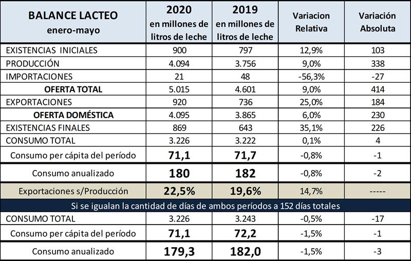 En base al Balance Lácteo estimado por OCLA a mayo del 2020 surge un consumo total del 0,1% superior al año anterior, el consumo per cápita para los primeros 5 meses del 2020 es de 71,1 litros/habitante de leche equivalente, que anualizado arroja un valor de 180 litros, -0,8% por debajo del registro del año 2019, y de 179,3 litros, -1,5% respecto al año anterior, si consideramos la misma cantidad de días para ambos períodos. Las cifras que arroja la metodología del Balance Lácteo son bastante similares a las de ventas totales del cuadro superior (Resolución 230/16), recordando que estas son una muestra de la población total.