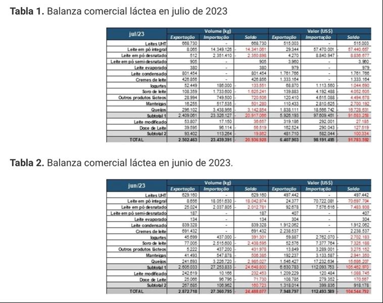 • BRASIL: balanza comercial de lácteos 9/8/2023