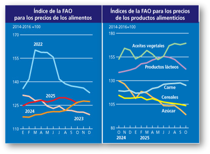 De la serie disponible de 430 meses (1990-2025) del Índice de FAO, 41 meses (9,5%), estuvieron por encima del índice del mes pasado.