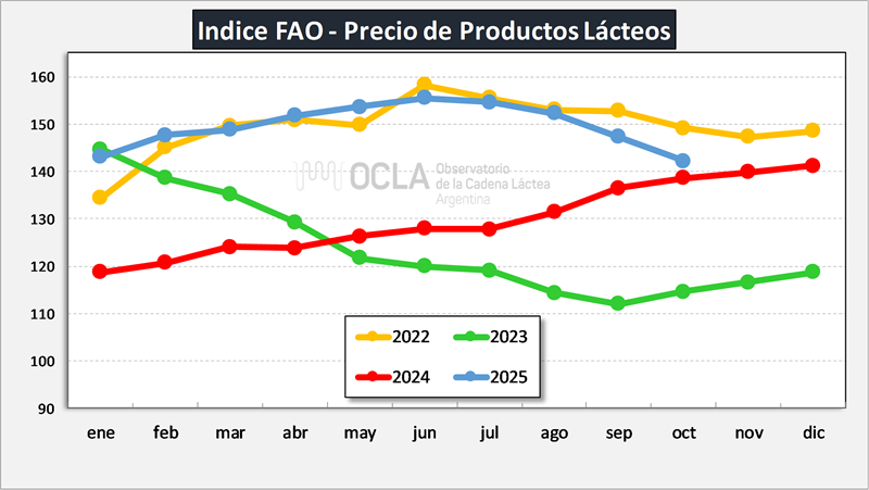 El índice de precios de los productos lácteos de la FAO se situó en octubre de 2025 en un promedio de 142,2 puntos, esto es, 5,0 puntos (un 3,4 %) menos que en septiembre, disminuyendo así por cuarto mes consecutivo. Pese a este descenso, el índice se mantuvo un 2,6 % por encima del nivel alcanzado el año anterior. Todos los subíndices registraron una caída: el de la manteca, de un 6,5 %; el de la leche en polvo entera, de un 6,0 %; el de la leche en polvo descremada, de un 4,0 %, y el del queso, de un 1,5 %. El descenso ininterrumpido del índice de precios relativo a la manteca obedeció en gran medida a las amplias disponibilidades exportables de Nueva Zelandia y la UE, ya que las moderadas temperaturas estacionales estimularon la producción de leche en un contexto de mayor debilidad de la demanda de importaciones de Asia y Oriente Medio. Las cotizaciones de la leche en polvo también registraron una caída, debido a la escasez de la demanda y a la fuerte competencia de las exportaciones. El índice de precios relativo al queso disminuyó apenas ligeramente, ya que un modesto descenso en la UE —donde los suministros de leche siguieron siendo suficientes y la demanda de exportaciones, moderada— se vio compensado en parte por el alza de los precios en Oceanía, que estuvo respaldada por los firmes pedidos de los países asiáticos y la mayor escasez de la oferta a principios de la campaña.
