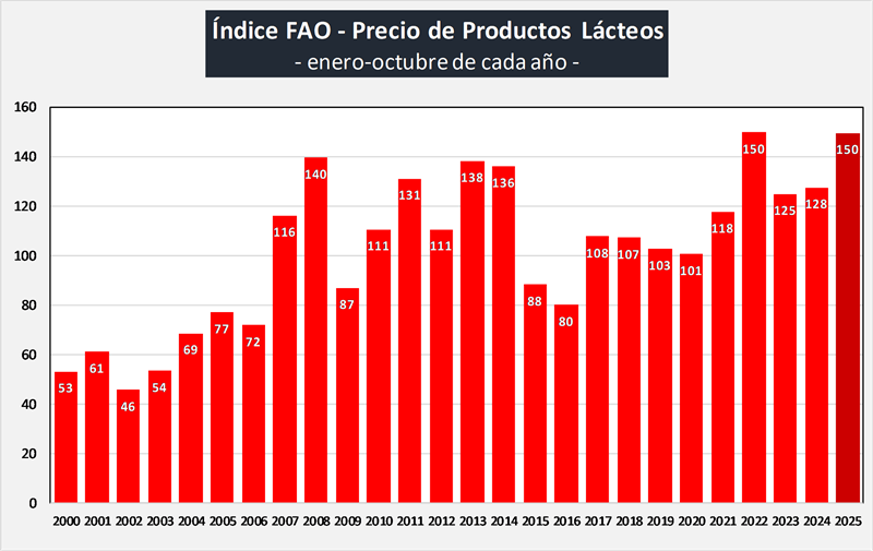 Por su parte el gráfico siguiente muestra el valor promedio de cada año del índice de precios de los lácteos de FAO de los últimos 26 años (2000-2025):