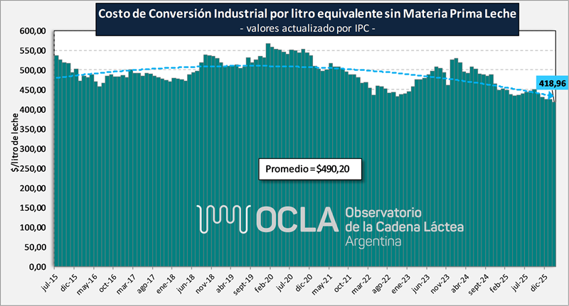 En el gráfico de abajo podemos ver la evolución mensual del índice en los últimos cuatro años donde el año 2025 que comenzó bastante alto, fue creciendo hasta junio de 2025 y luego comenzó un descenso pronunciado, incluso perforando en noviembre y diciembre al año 2024 y acercándose al año 2023 al final. El 2026 inicia entre los valores más bajos luego de las caídas de finales del año anterior.