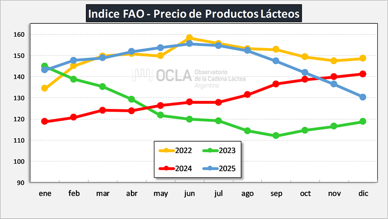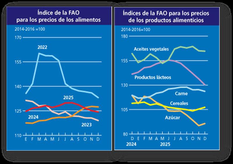 El índice de precios de los productos lácteos de la FAO fue de 130,3. disminuyó 5,9 puntos (un 4,4 %) en diciembre. Los precios de la manteca registraron una caída pronunciada, impulsados por la mayor disponibilidad estacional de nata en Europa y la acumulación de reservas tras la fuerte producción registrada a principios de año. Los precios de la leche entera en polvo también disminuyeron, como consecuencia del máximo estacional alcanzado por la producción lechera en Oceanía y del menor interés de compra de las principales regiones importadoras. Por el contrario, los precios de la leche desnatada en polvo y del queso se redujeron de forma más moderada. Los precios de la leche desnatada en polvo descendieron ante la amplia disponibilidad para la exportación y la estabilidad de las variables fundamentales del mercado, mientras que los precios del queso disminuyeron en general. El buen abastecimiento de los mercados y la ralentización de la demanda de exportaciones en Europa compensaron la subida de los precios del queso en Nueva Zelandia, donde el nivel máximo alcanzado por la oferta de leche se vio absorbido principalmente por productos con mayor flexibilidad en términos de elaboración, en particular la manteca y las leches en polvo. Pese a los descensos recientes, el índice de precios de los productos lácteos de la FAO alcanzó un promedio de 146,9 puntos en 2025, es decir, un 13,2 % por encima del promedio de 2024, lo que refleja las fuertes subidas de precios durante la primera mitad del año. El aumento anual obedeció principalmente al queso, la leche entera en polvo y la manteca, que se vieron respaldados por la fuerte demanda mundial de importaciones y la escasa oferta para la exportación a principios de año, mientras que los precios de la leche desnatada en polvo aumentaron apenas de forma marginal, a raíz de su amplia disponibilidad y un crecimiento de la demanda relativamente moderado.